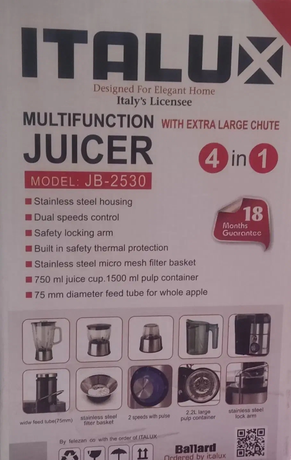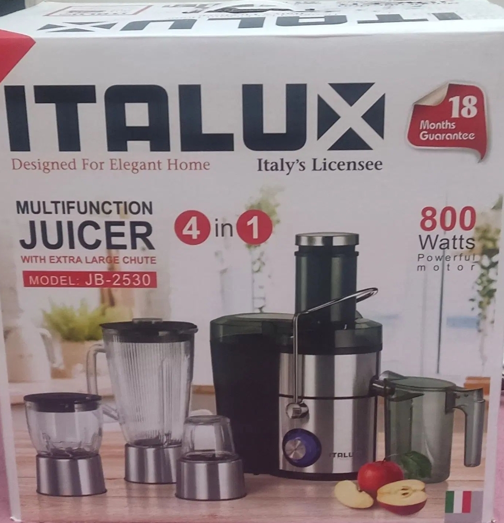 آبمیوهگیری ۴ کاره Italux مدل JB-2530 یکی از پرفروشترین مدلهای چندکاره بازار است که با طراحی زیبا، موتور قدرتمند ۸۰۰ وات و لوازم جانبی کامل، یک دستگاه همهفنحریف برای آشپزخانه شماست.